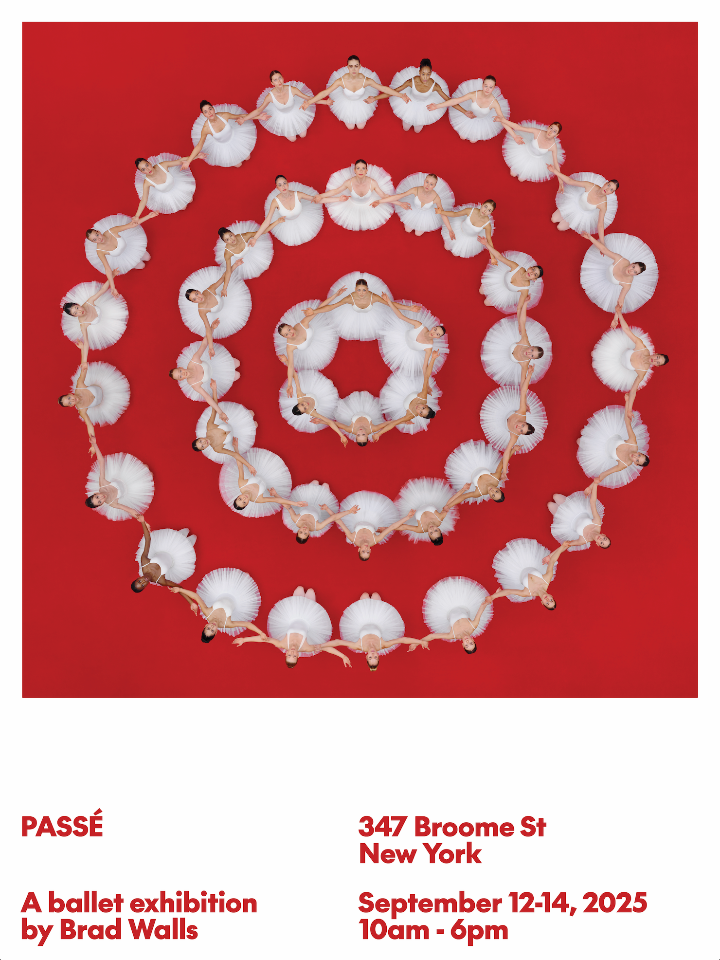 Captured from above, this composition showcases the scale, geometry, and precision of one of the largest ballet photoshoots ever staged in New York City. The contrast of white tutus against the deep red stage creates a striking visual that embodies the exhibition’s red-room concept.