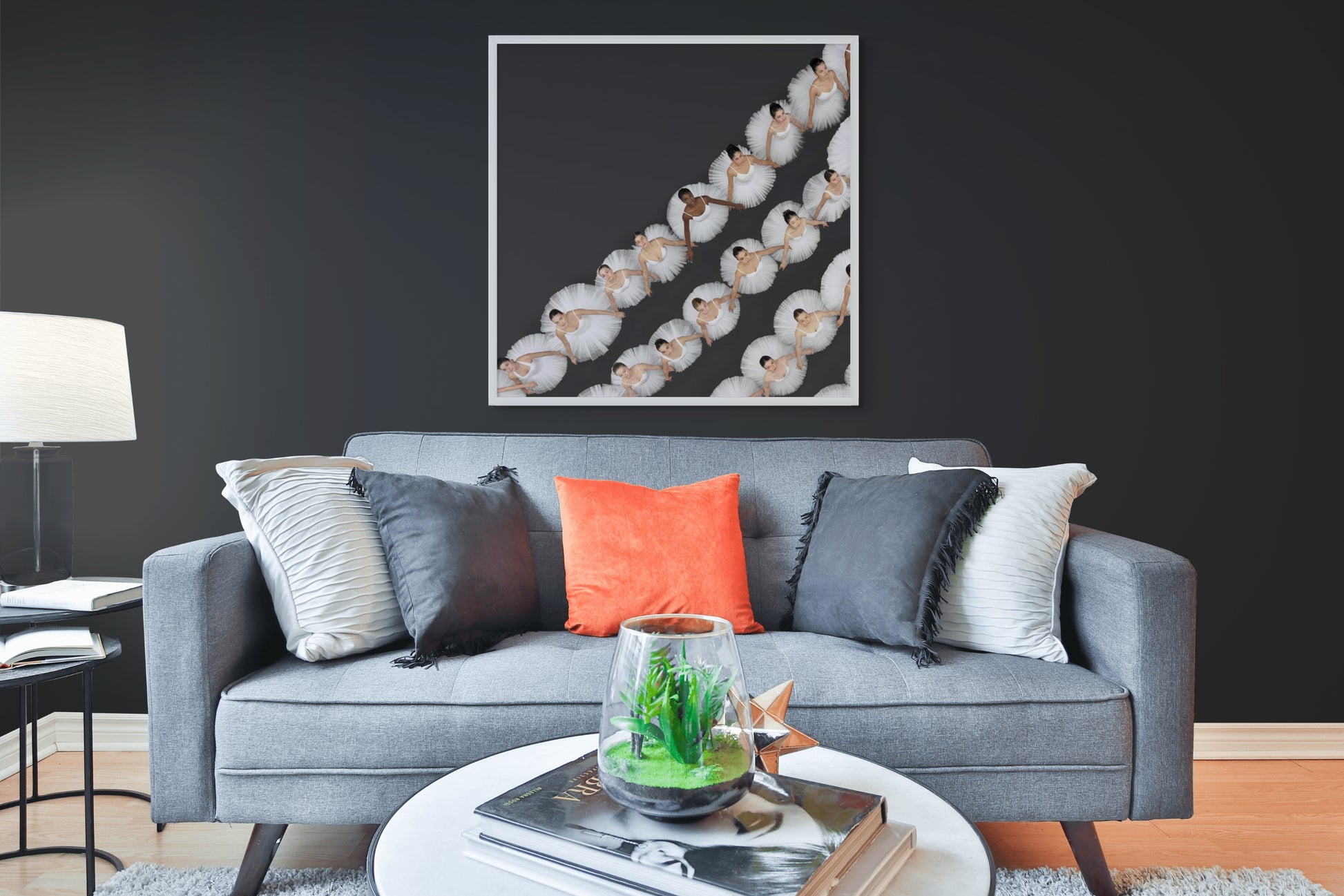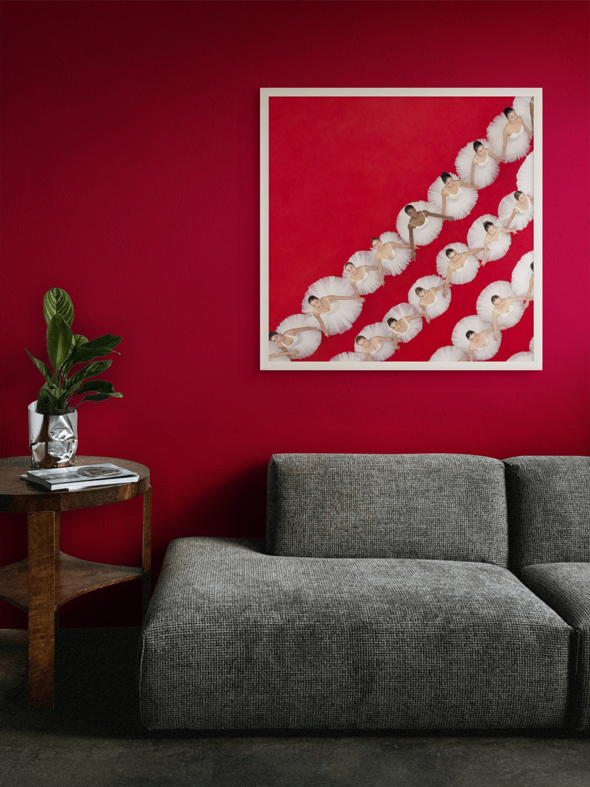 A diagonal river of tutus — flowing, repeating, unstoppable. Cascade finds the momentum hidden inside stillness, and the individual hiding inside the pattern