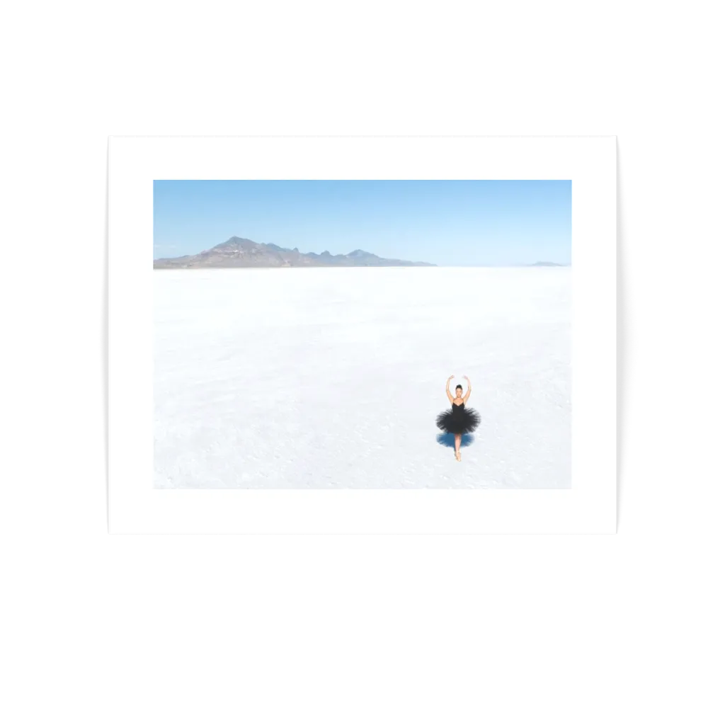 From the Swan Lake on Salt Lake series, Her World places a single ballerina at the center of an expansive, almost endless landscape. Captured from above, the dancer appears small against the vast salt flats and distant mountains, creating a sense of quiet introspection. The work explores solitude, scale, and inner space—where ballet becomes a personal world set within an infinite horizon.
