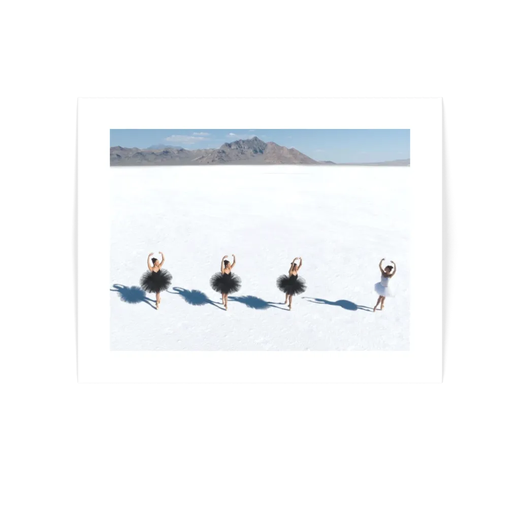 From the Swan Lake on Salt Lake series, Idyllic presents a small group of ballerinas aligned across the salt flats, their raised arms and shadows forming a gentle rhythm against the open landscape. Shot from above, the scene feels calm and expansive, balancing collective harmony with individual presence. The work explores serenity, order, and the quiet beauty found in shared movement.