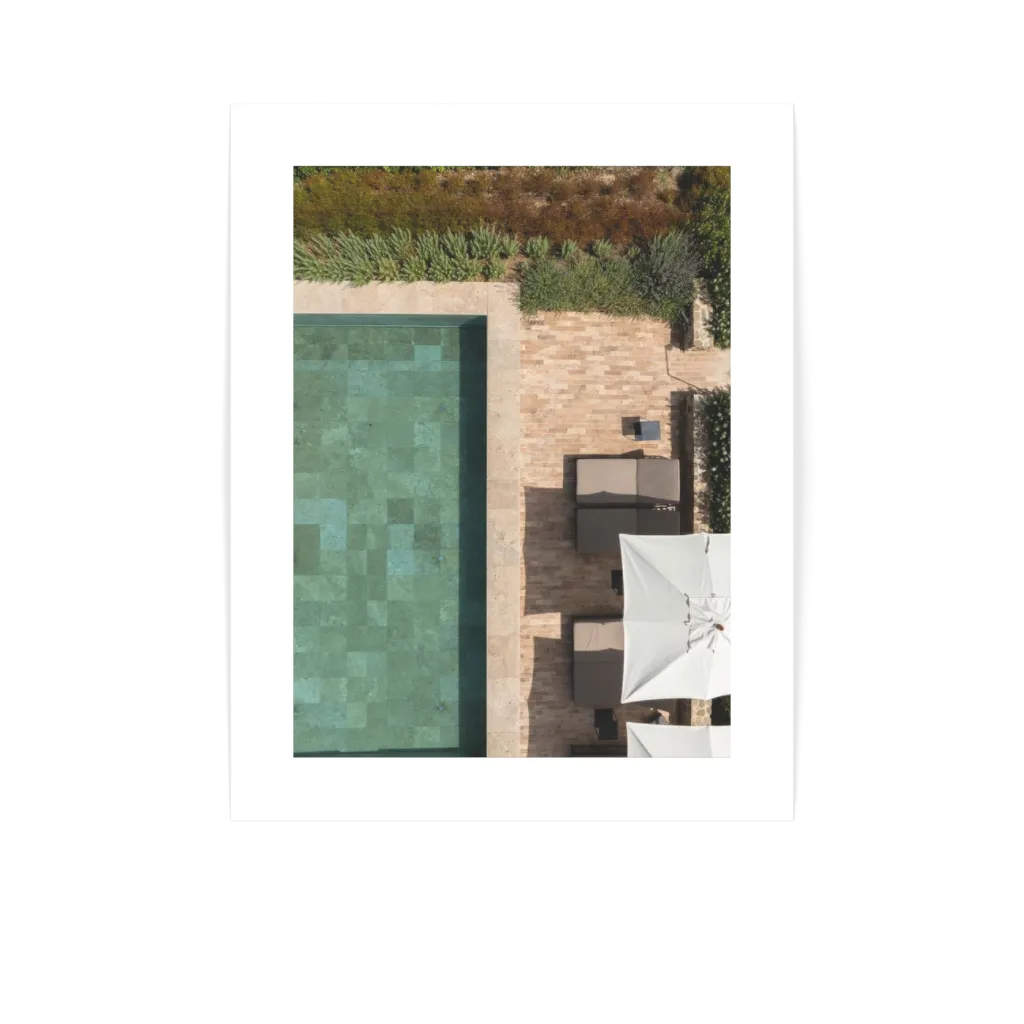 Photographed from above at Vocabolo Moscatelli in Umbria, Italy — this piece captures the harmony of stone, water, and light in Brad Walls’ signature geometric style.